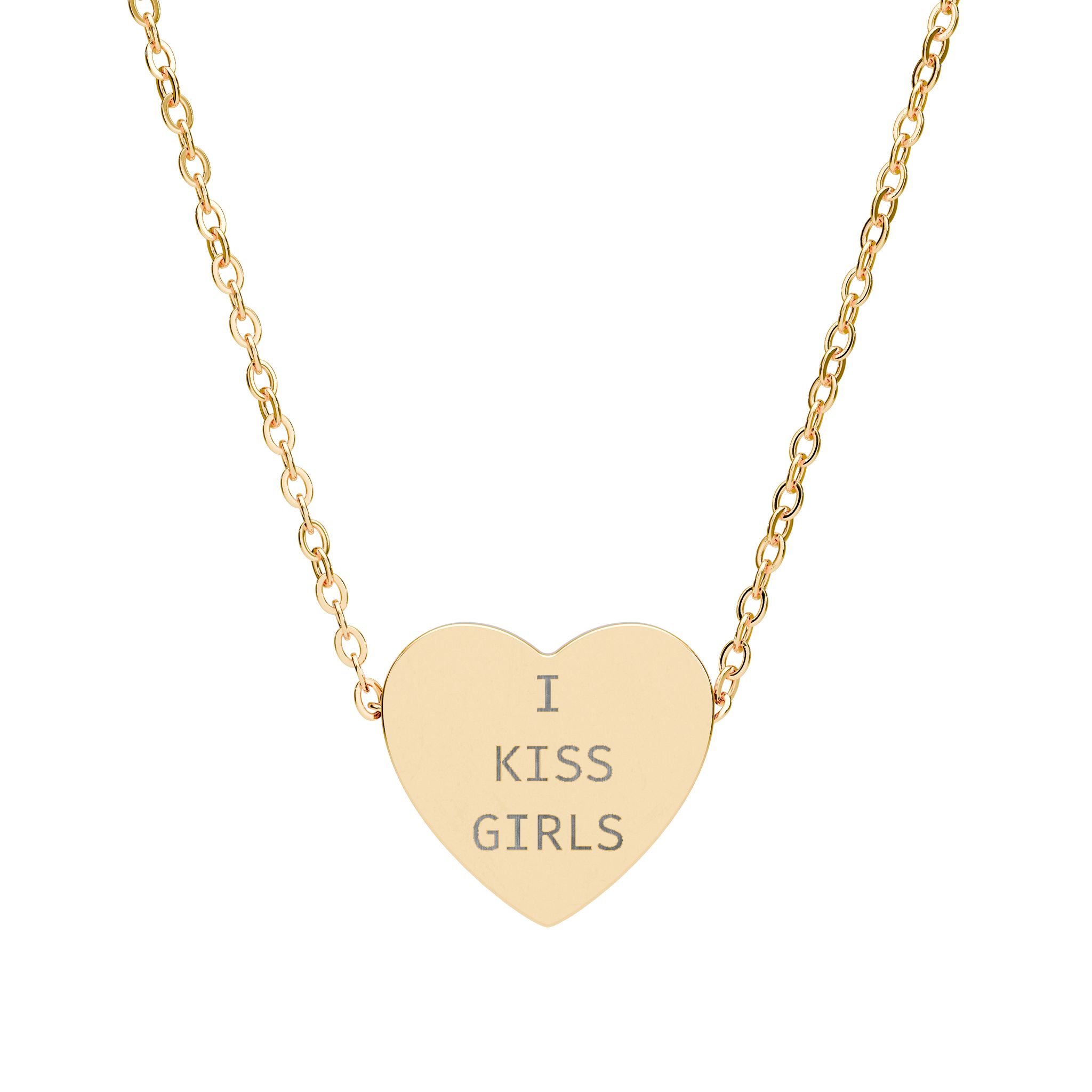 This heart-shaped necklace features a bold engraved message—“I Kiss Girls”—created as a quiet, confident expression of sapphic lesbian WLW pride.