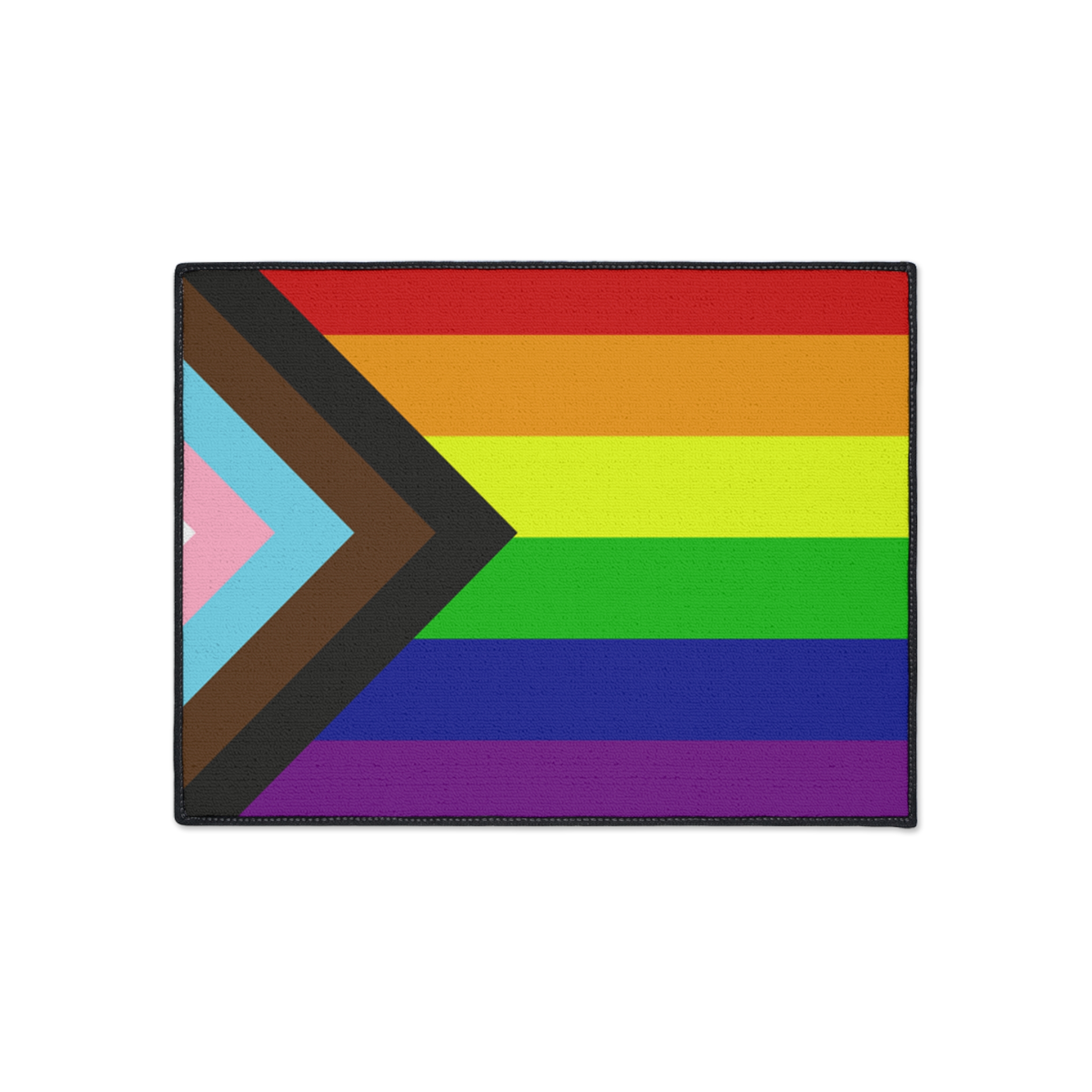 This progress pride flag floor mat showcases the progressive rainbow design in a clean modern layout made for everyday indoor use. Built with durability and function in mind it features a non slip rubber backing to keep it securely in place on hard floors while resisting wear from daily foot traffic.