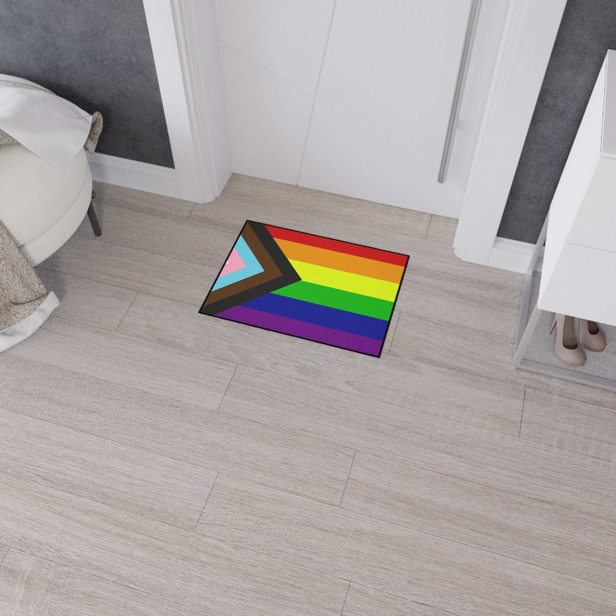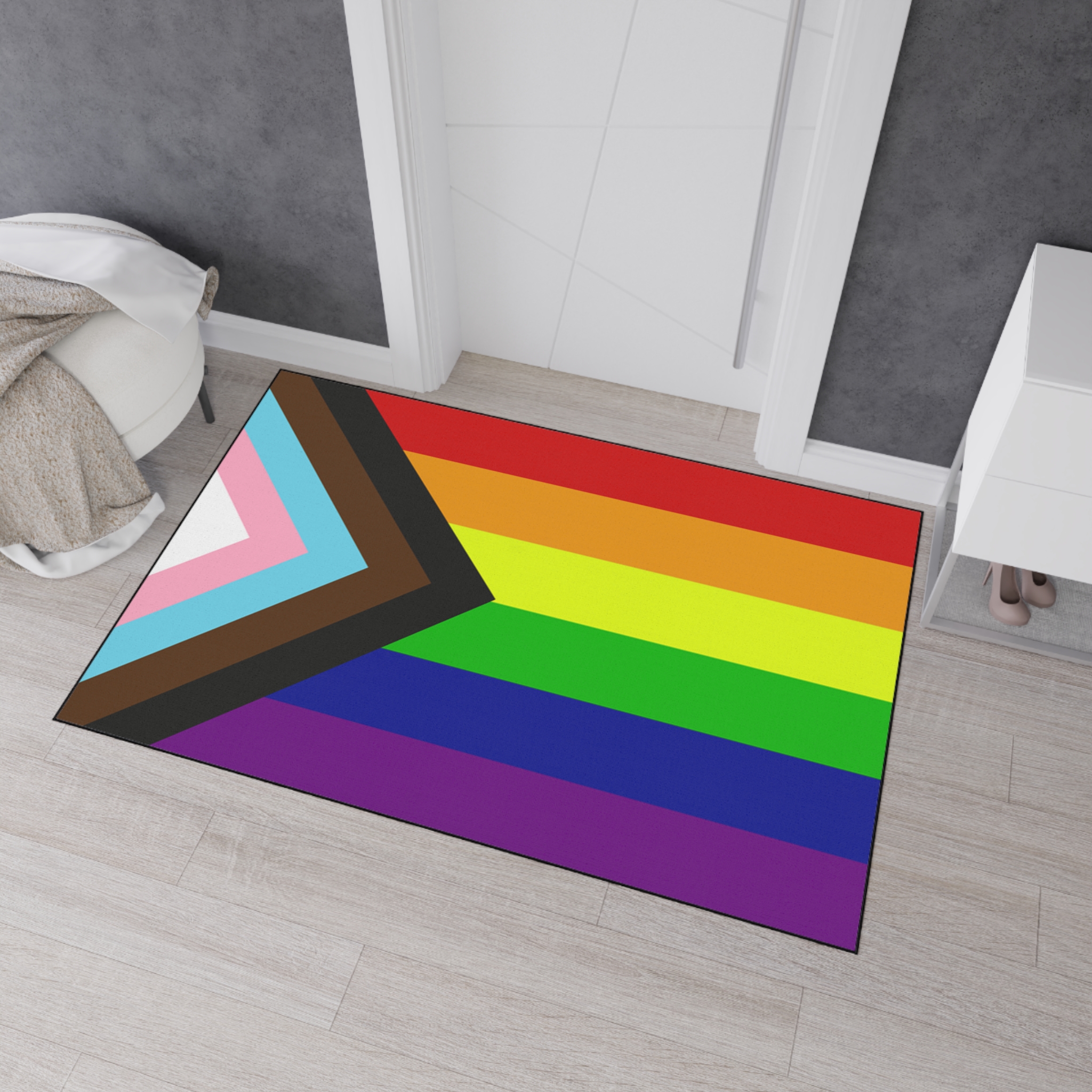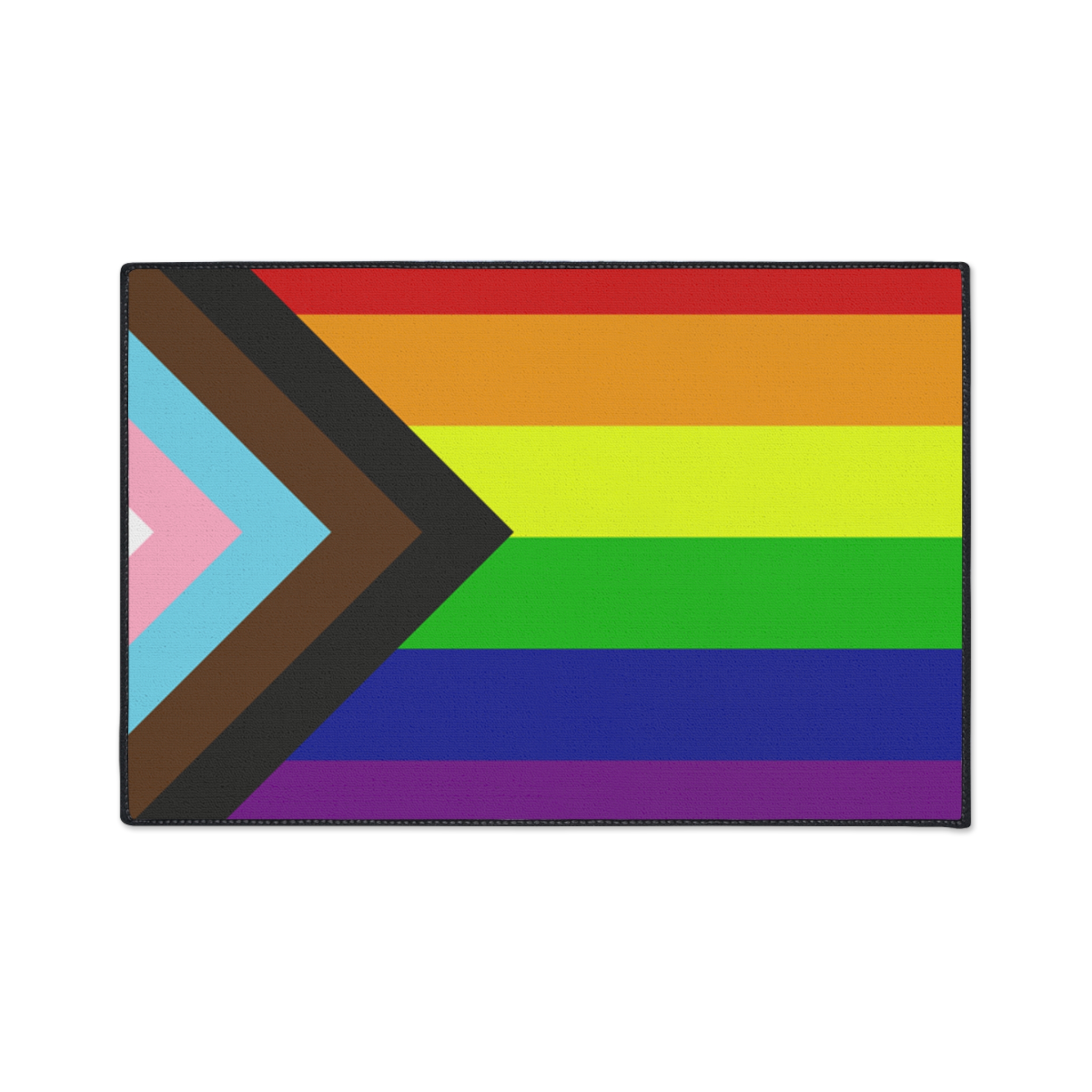 This progress pride flag floor mat features a progressive rainbow design on a durable non slip entryway rug made for LGBTQ pride homes apartments and studios.