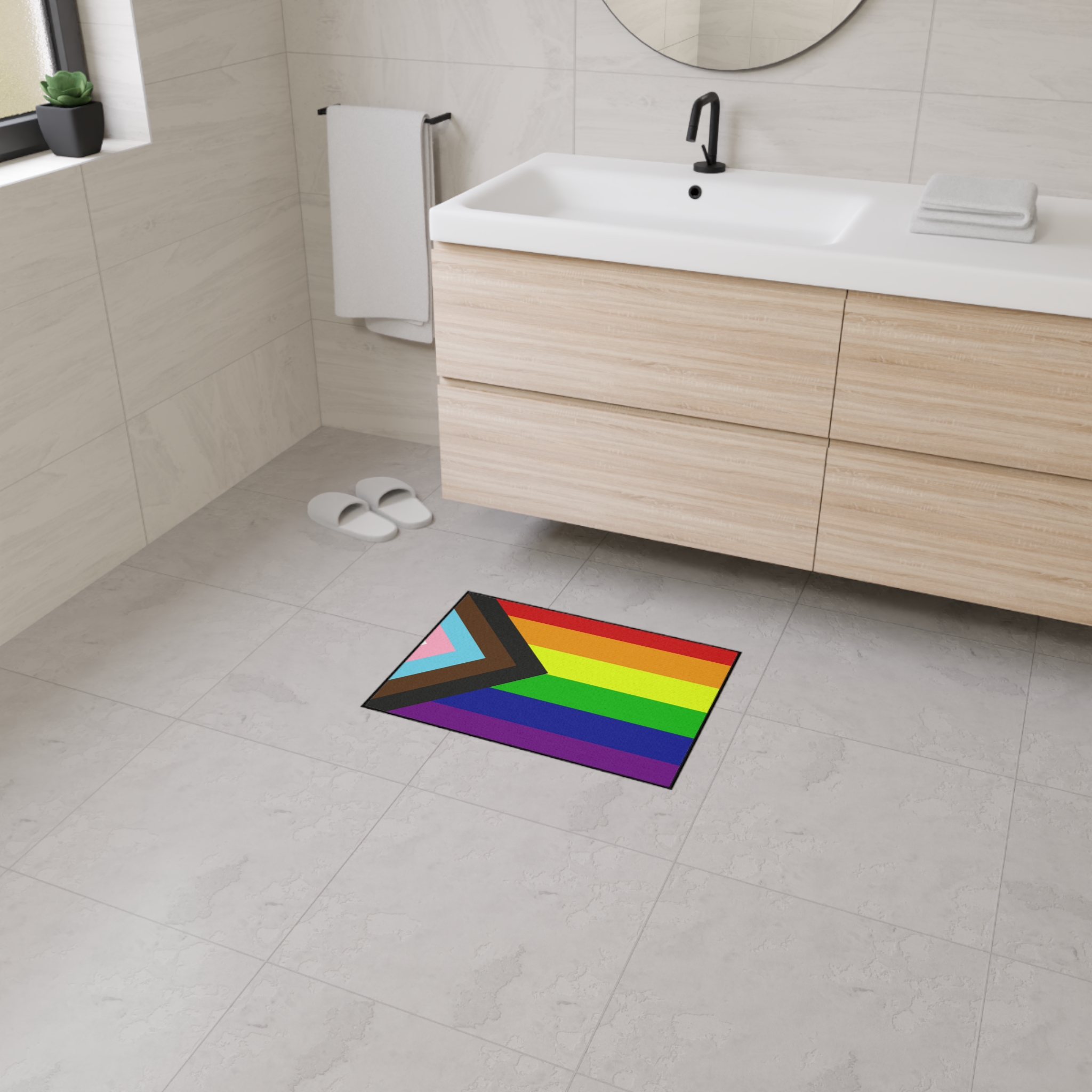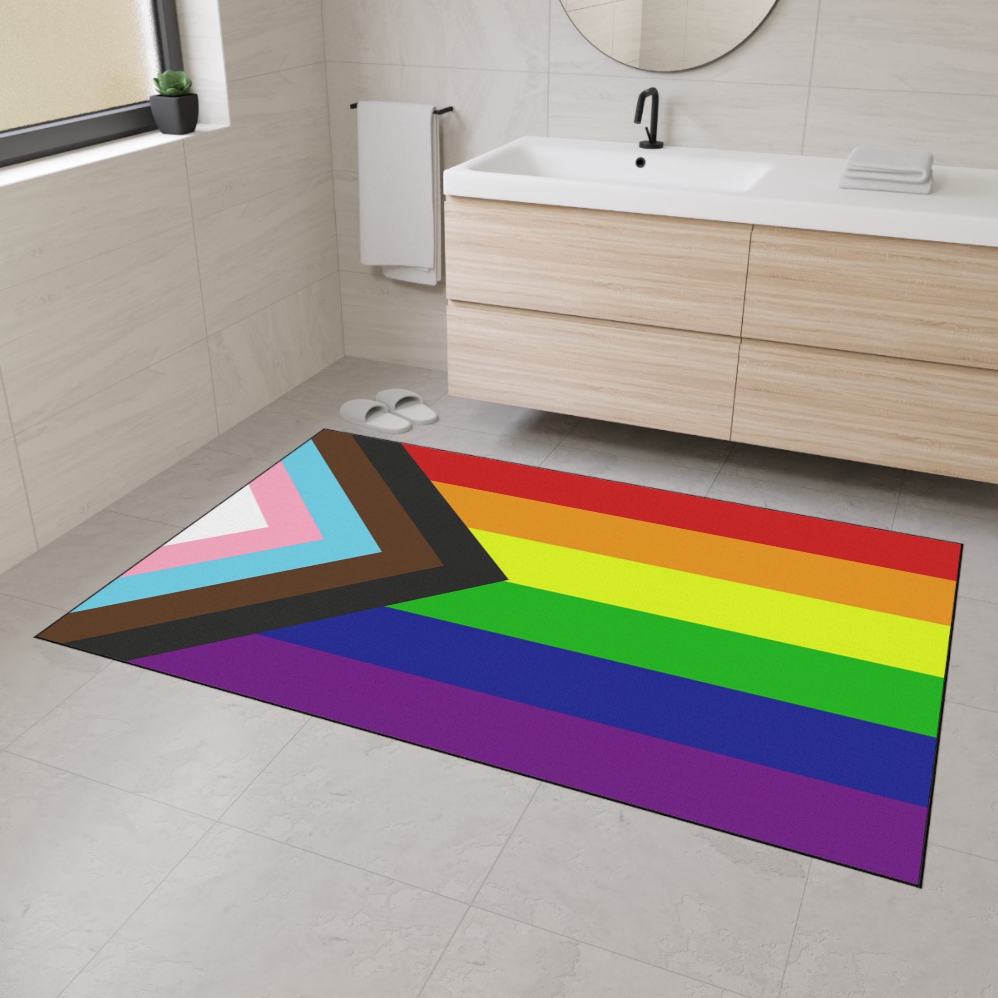 Bright, sturdy, and thoughtfully made — this floor mat brings bold Pride colors into everyday corners of your home. The textured polyester surface holds vibrant, true-to-design printing while the dense rubber backing grips floors so the mat stays put by the door, in a hallway, or under a cozy reading nook. The slim black trim keeps edges tidy, and the one-sided design showcases the full rainbow and progress chevrons with crisp detail. It settles into busy life: wiping shoes after a walk, anchoring a plant cluster, or marking a safe, welcoming space for friends and chosen family.